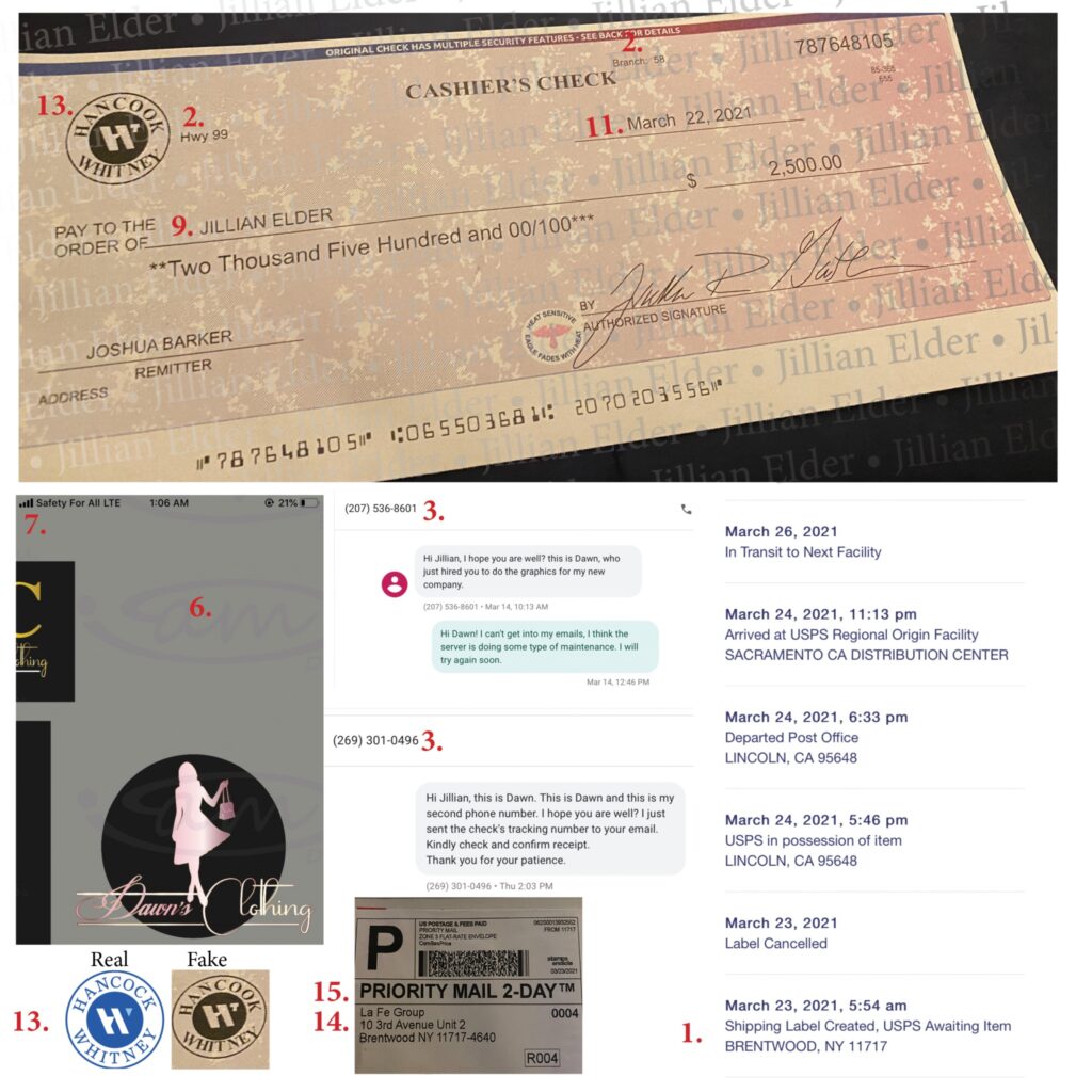 Two days later I received an email telling me that her accountant screwed up and I would be getting far more money than what we agreed on. I stopped the project right then and there. She wanted to give me specific instructions on how to send the money back. I went on my google analytics account and saw on the day that Dawn first emailed me, there was a hit from Zhengzhou, China. I let it go. The next day I woke up to a bunch of text messages from Dawn, the text message numbers came from a 207 number which was Maine telling me the check was on the way and I should have it within a few days. Since Dawn told me she was from Connecticut, I was expecting a 203 or 860 number, not a 207.  I told Dawn I was no longer working on her project there were too many red flags, plus one of her messages was all in caps “JILLIAN ARE YOU THERE?” Because I didn’t answer her fast enough. And if you know me, don’t speak to me in caps. I don’t need to be yelled at via a text message. I told her I was no longer working on her project and to seek another designer, there are too many red flags. I didn’t hear from her and figured she took the hint and moved on. I went back to doing what I was working on, which was SEO stuff.