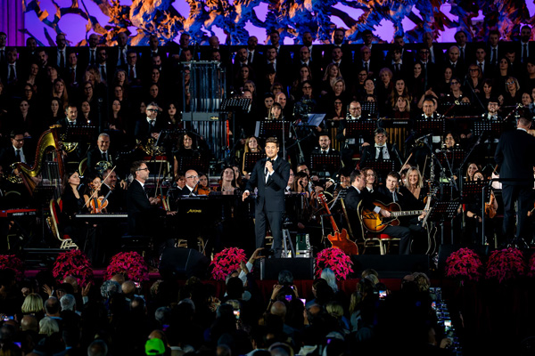Accompanied by the Nova Opera Orchestra conducted by Nicholas Jacobson-Larson, Bublé performed a program curated specifically for the occasion, blending selections from his catalog with Christmas classics. The set included “Feeling Good,” “It’s Beginning to Look a Lot Like Christmas,” “Silent Night” and “Ave Maria,” which Bublé sang in Latin with choral and orchestral accompaniment.